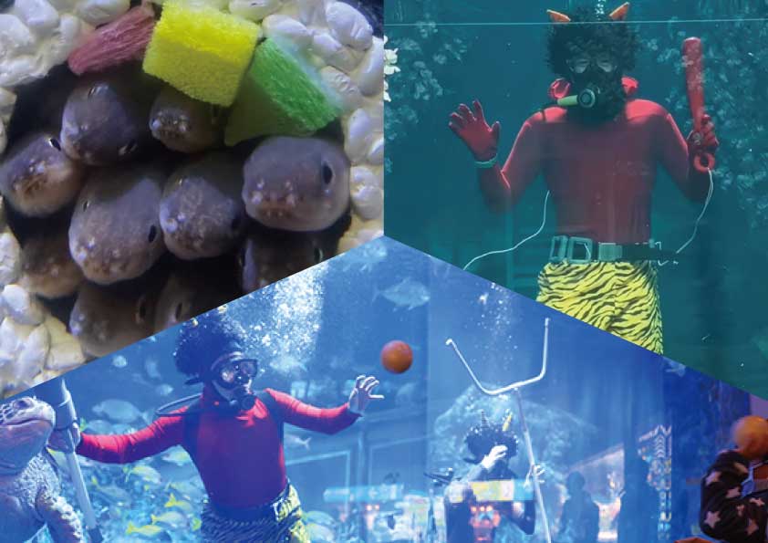 迫力満点の「エントランスホール」の大型水槽などに、赤鬼や青鬼に扮したダイバーが登場。